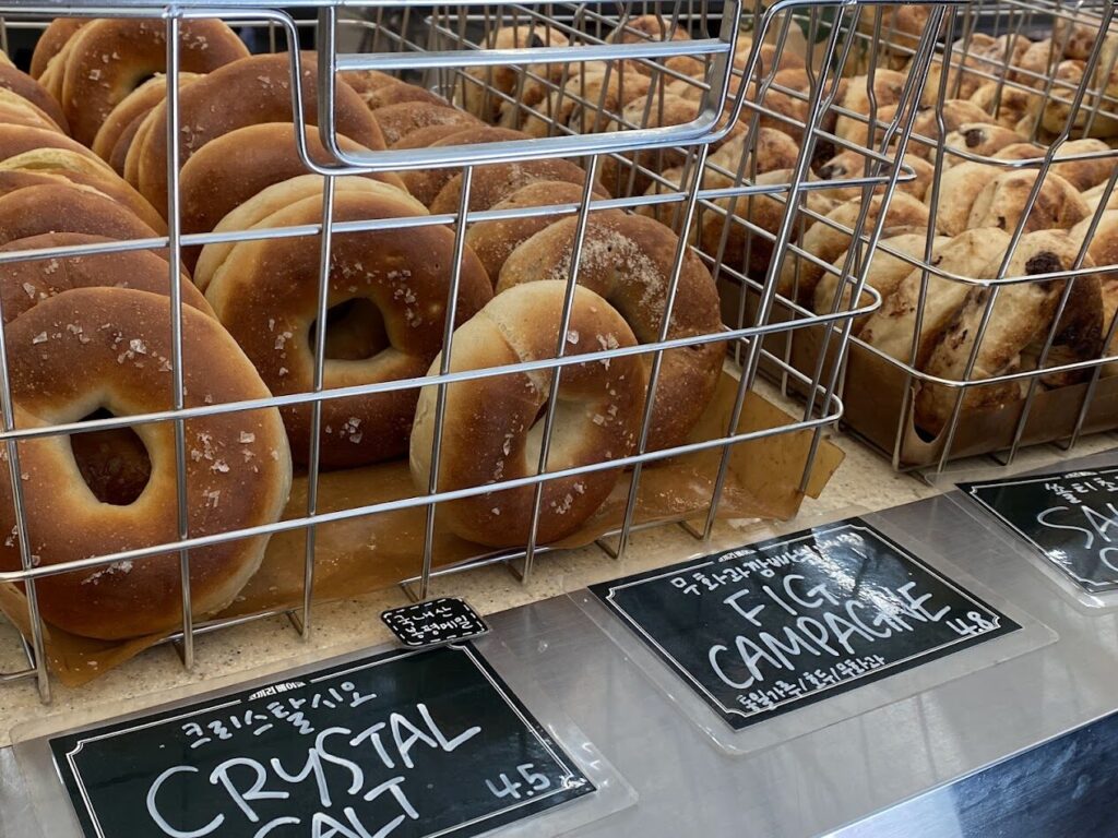 店内はたくさんのベーグルが!どれもおいしそう。お客さんもたくさんいました。The shop was filled with so many delicious-looking bagels, and it was very crowded.
