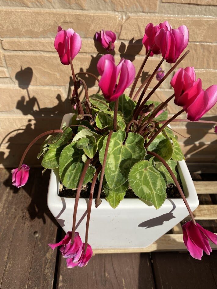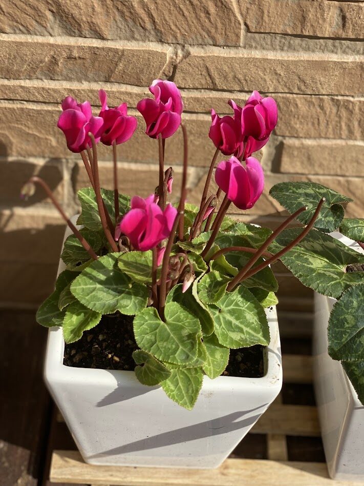 I bought garden cyclamen in November and planted them in pots. I tried growing them for the first time last year, and I loved their beautiful colors and how long they lasted, so this year I decided to add two more.